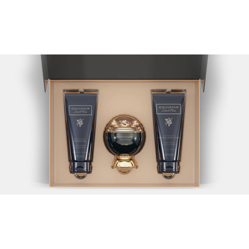 Afnan Souvenir Desert Rose Gift Set is a luxurious Fruity Woody fragrance crafted for unisex wear, offering a perfect balance of freshness, sweetness, and sensual warmth. This elegant gift set includes a 100 ml Eau de Parfum, 100 ml Body Lotion, and 100 ml Shower Gel, creating a complete and immersive fragrance experience. Designed for those who appreciate elegance and versatility, this scent captivates with its luminous fruitiness and soft floral heart, enveloped in creamy woods and amber undertones.