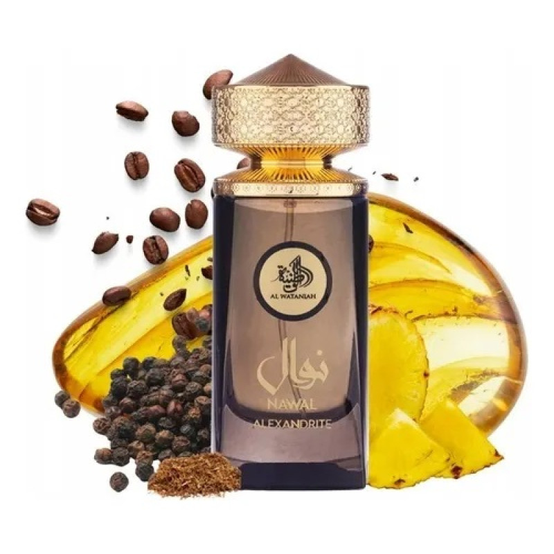 Al Wataniah Nawal Alexandrite Eau de Parfum is a unisex Oriental Woody Spicy fragrance with notes of black pepper, pineapple, tobacco, patchouli, coffee, iris, vanilla, amber, and labdanum. It offers a bold, rich, and sophisticated scent.