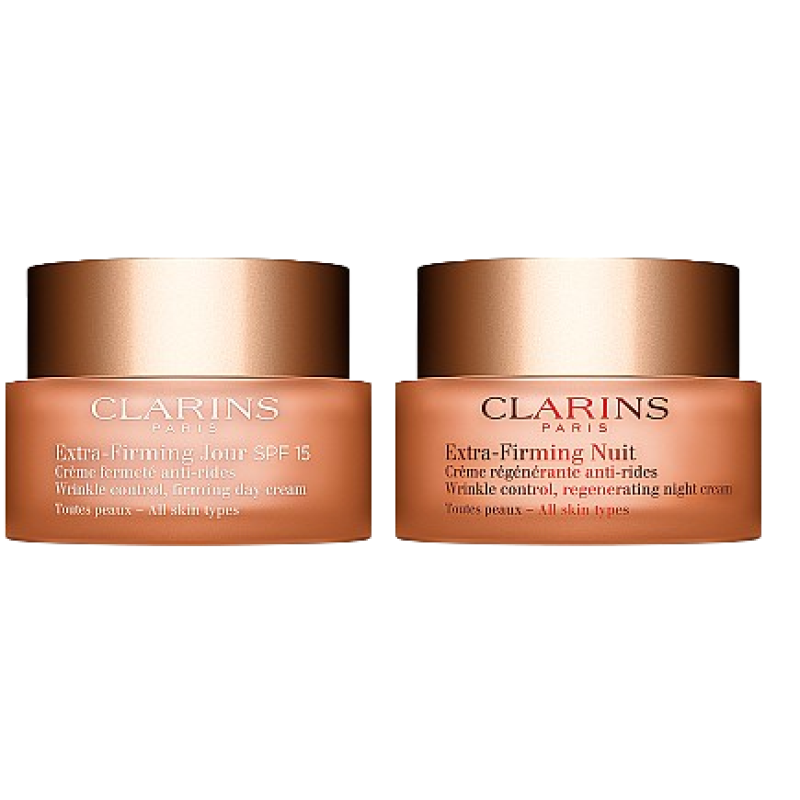 Clarins Extra-Firming Partners Set pairs day and night creams that smooth wrinkles, boost firmness and revive radiance. Plant-powered formulas strengthen elasticity, lift contours and leave skin looking refreshed, toned and youthful.
