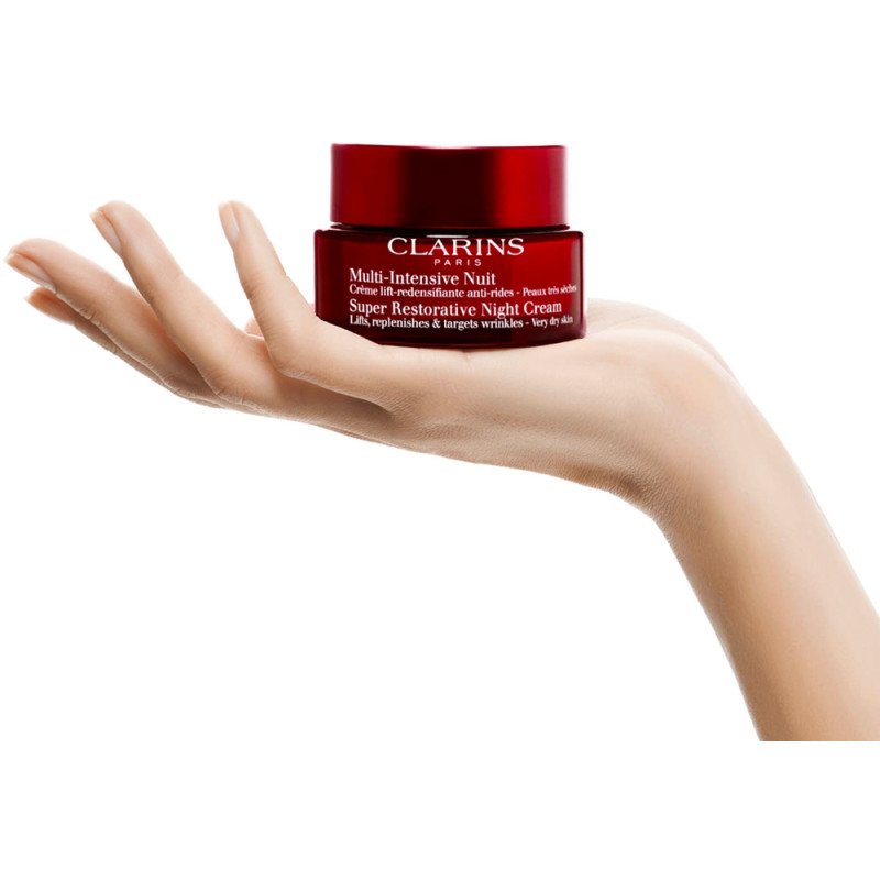 Clarins Super Restorative Night Cream for Very Dry Skin delivers intense overnight nourishment, boosting firmness and density with Harungana and gorse extracts. It smooths wrinkles, restores radiance and leaves mature skin comforted and revitalised by mor