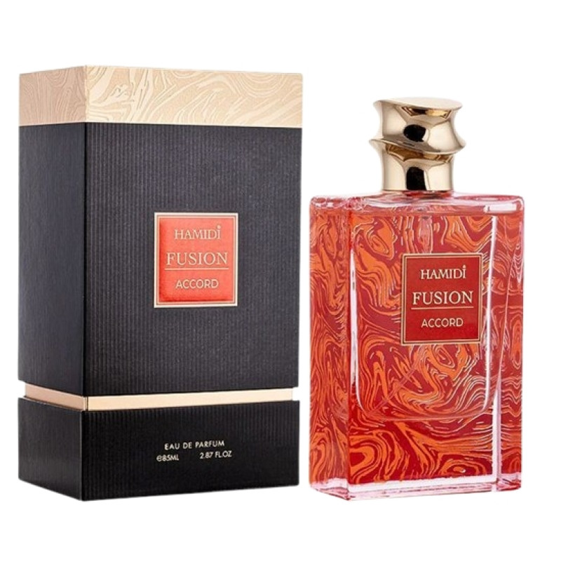 Hamidi Fusion Accord Eau de Parfum is a unisex Fruity Woody fragrance with pineapple, bergamot, black currant, birch, patchouli, jasmine, musk, and vanilla. Bright, elegant, and long-lasting, it balances fresh fruits with warm, sensual woods.