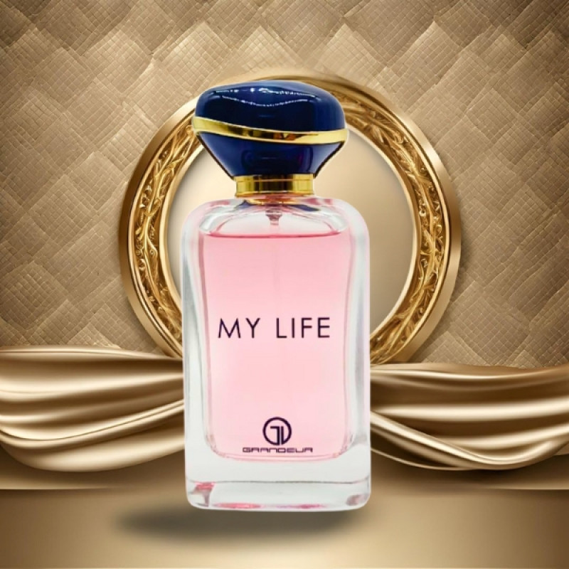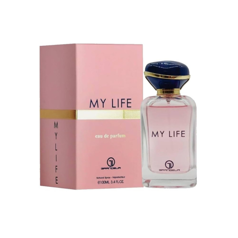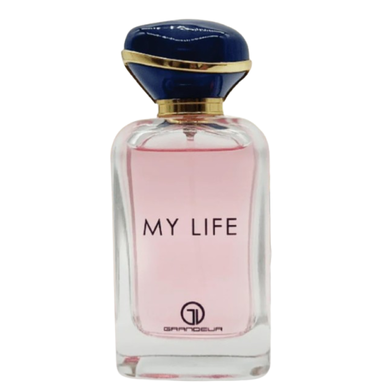 Grandeur My Life Eau de Parfum is a 100 ml women's Floral Woody fragrance from the UAE with top notes of orange blossom and bitter orange, a heart of Indian tuberose, and a base of Madagascar vanilla and sandalwood for a fresh, elegant, and long-lasting s
