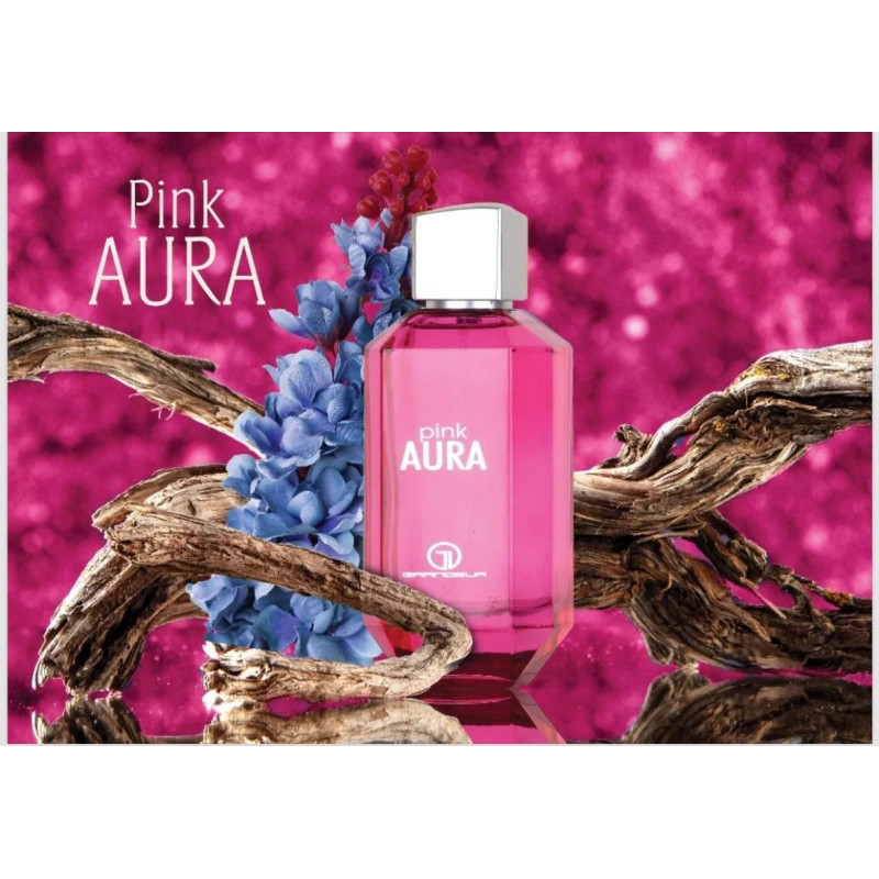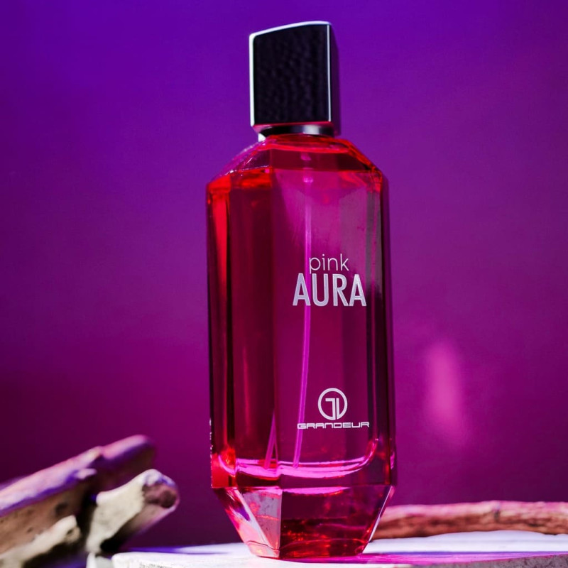Grandeur Pink Aura Eau de Parfum is a 100 ml women's Fruity Floral fragrance from the UAE, blending raspberry, lychee, and black currant with a floral heart of rose and magnolia, finished with a warm base of benzoin, amber, and patchouli for a playful, la