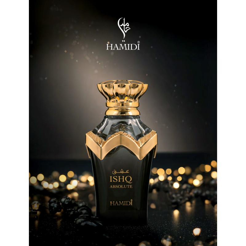 Hamidi Ishq Absolute Eau de Parfum is a fresh men's fragrance featuring vibrant grapefruit, yuzu, and pink pepper top notes. Its marine and violet leaf heart blends into a warm, woody base of ambergris and guaiac wood, creating a long-lasting, uplifting s