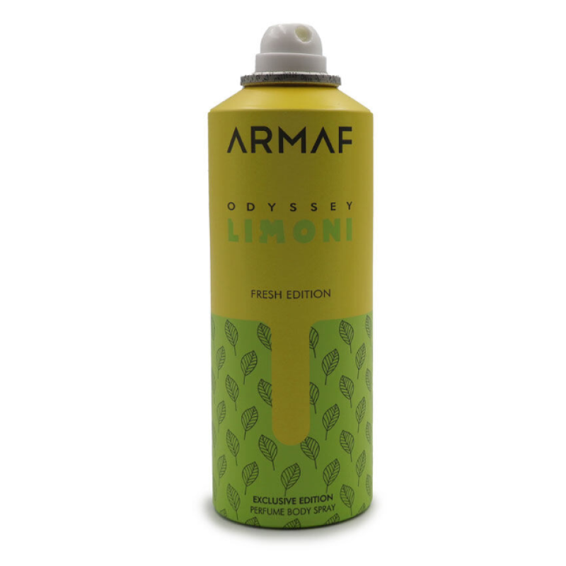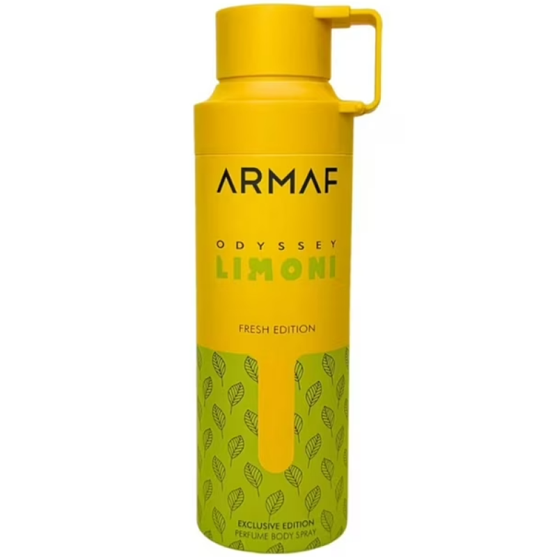 Armaf Odyssey Limoni Fresh Body Spray 200 ml is a unisex citrus-aromatic fragrance with lemon, orange, mandarin, bergamot, ginger, tea, and musk, delivering a fresh, invigorating, and long-lasting scent that energizes and uplifts.