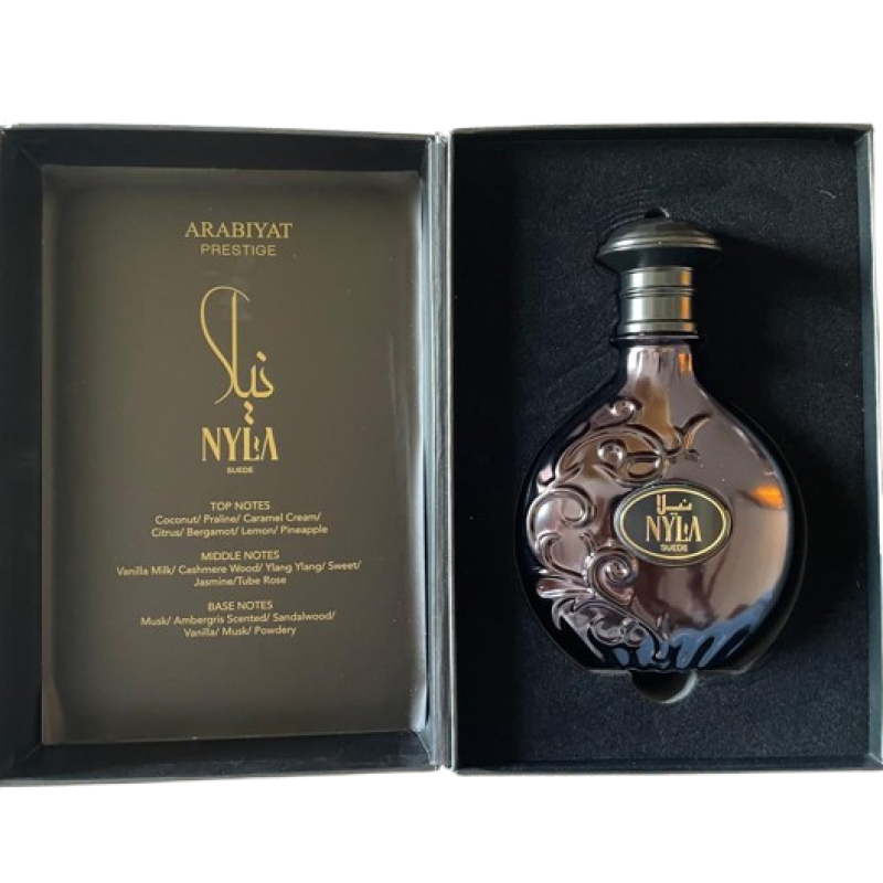 Arabiyat Prestige Nyla Suede Eau de Parfum 80 ml is a unisex gourmand leather fragrance with notes of coconut, praline, vanilla, cashmere wood, musk, and leather, offering a sweet, sophisticated, and long-lasting scent.