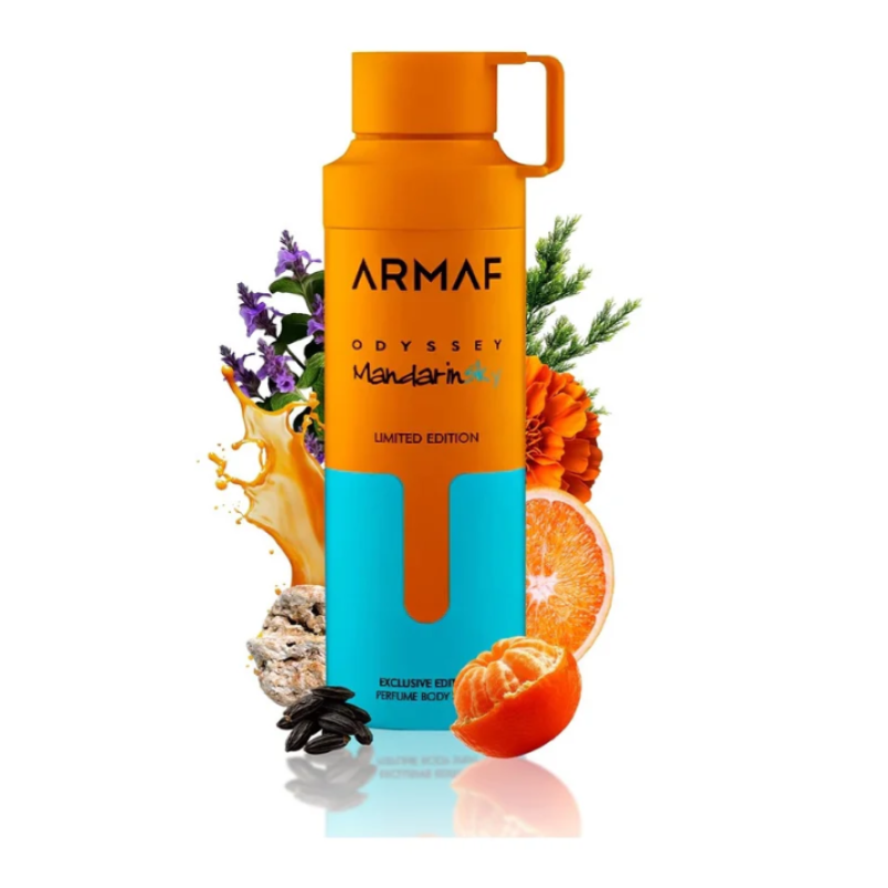 Armaf Odyssey Mandarin Sky Body Spray 200 ml is a men’s amber-woody fragrance with mandarin, saffron, caramel, tonka bean, cedar, and vetiver, offering a fresh, vibrant, and long-lasting scent perfect for daily wear and active lifestyles.