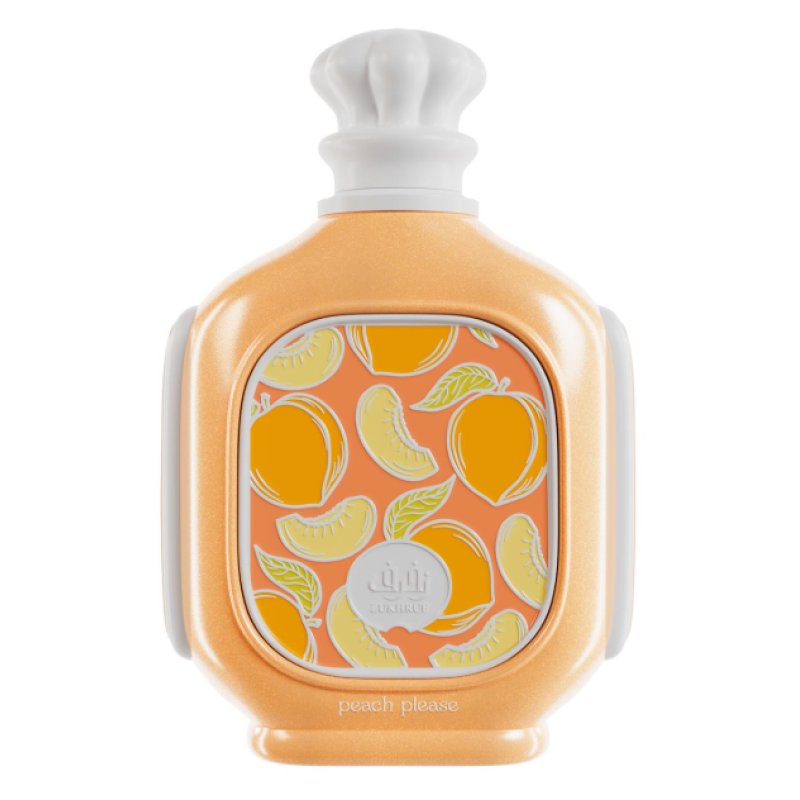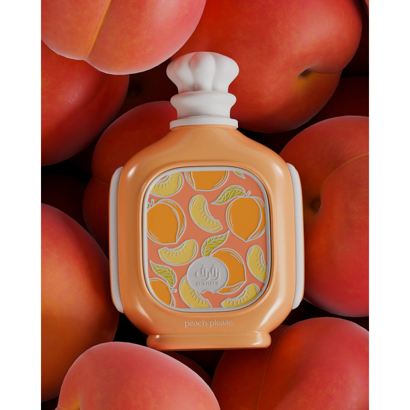 Zimaya Zukhruf Peach Please EDP 100 ml blends juicy peach and guava with caramel, cinnamon and a warm amber-musk base, creating a creamy fruity-gourmand scent that feels playful, cosy and irresistibly inviting for anyone who loves sweet fragrances.