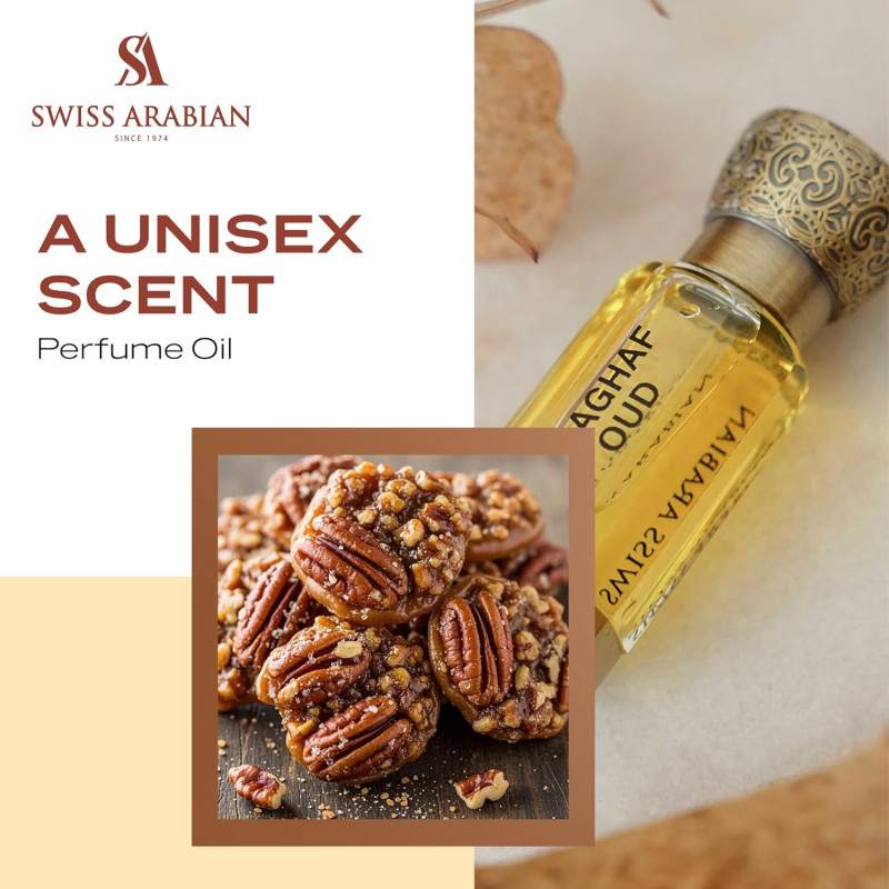 Swiss Arabian Shaghaf Oud is a luxurious unisex perfume oil blending rich oud with saffron, rose and a touch of praline, softened by creamy vanilla. Deep, warm and elegant with exceptional longevity, ideal for evenings and cooler seasons.