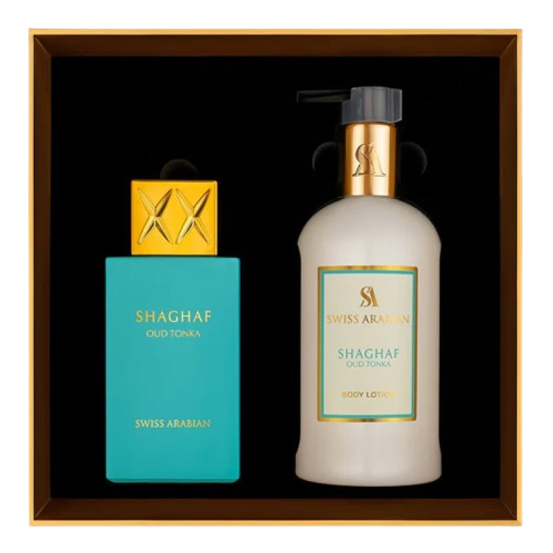 Swiss Arabian Shaghaf Oud Tonka Gift Set is a luxurious unisex fragrance duo that combines an indulgent gourmand scent with nourishing body care for a complete and immersive olfactory experience. This elegant set pairs the warm, addictive Eau de Parfum with a generously sized matching body lotion, allowing the signature scent to be layered and enjoyed for longer-lasting intensity.