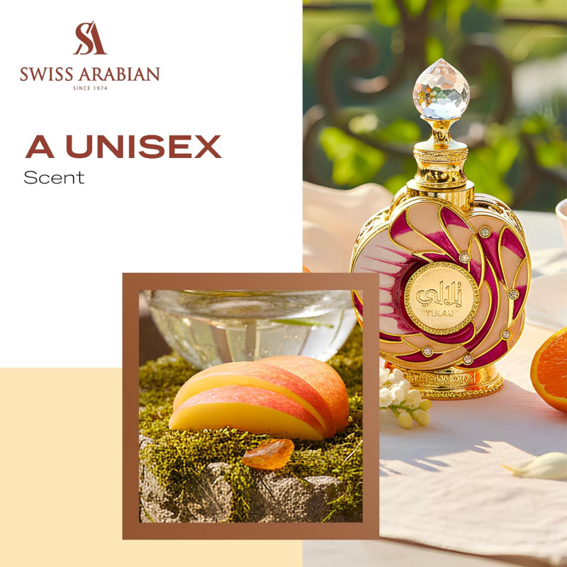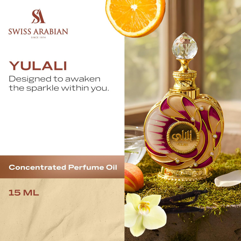 Swiss Arabian Yulali is alcohol-free unisex perfume oil with fresh citrus and juicy fruits, soft white florals and a warm base of sandalwood, vanilla and amber. Smooth, long-lasting and intimate scent ideal for everyday wear and cooler seasons.