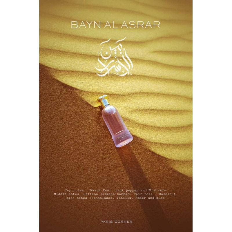 Paris Corner Bayn Al Asrar EDP 80 ml is a refined unisex floral-oriental fragrance with nashi pear and pink pepper, a rich heart of saffron, jasmine and Taif rose, and a warm base of sandalwood, vanilla, amber and musk for a mysterious, elegant trail.