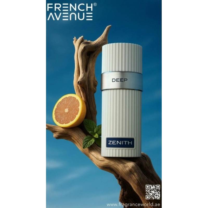 French Avenue Zenith Deep Extrait de Parfum 100 ml is a bold men’s woody-aromatic fragrance with fresh citrus, mint, and pepper, an aromatic spicy heart, and a deep base of incense, woods, and amber. Intense and long-lasting.