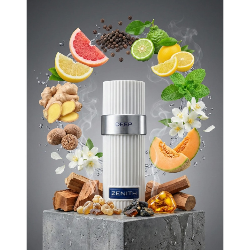 In the dry-down, Incense, Sandalwood, Cedarwood, Labdanum, and Amber create a powerful and long-lasting base. This foundation is smoky, woody, and resinous, leaving a smooth yet commanding trail that reinforces the fragrance’s confident identity. The extrait concentration ensures intensity and durability, making Zenith Deep a reliable choice throughout the day and into the night.