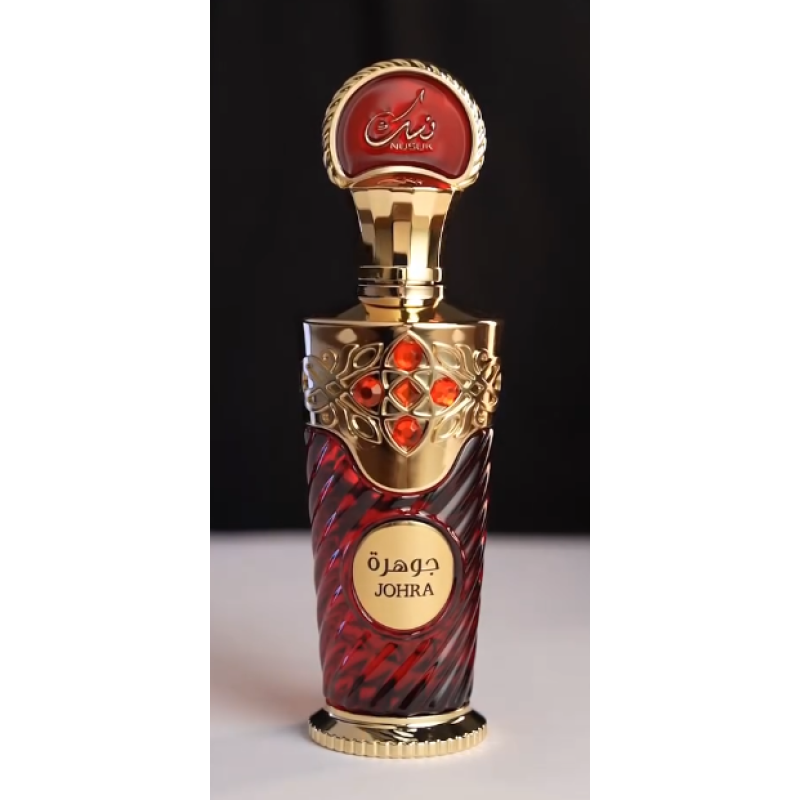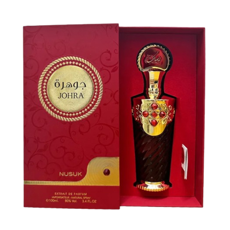 Nusuk Johra Extrait de Parfum 100 ml is a refined women’s floral-fruity fragrance with bergamot, lychee, and red fruits, a rose-magnolia heart, and a soft base of vanilla, musk, and cashmeran. Elegant and sensual.
