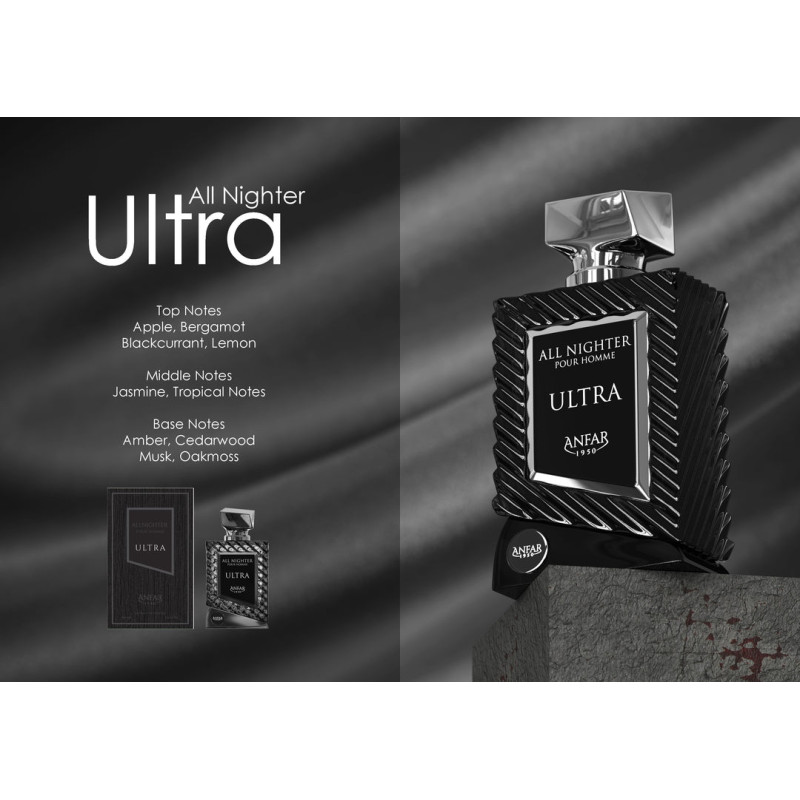 Anfar 1950 All Nighter Ultra Extrait de Parfum 100 ml is a woody aromatic fragrance for men with apple, bergamot, blackcurrant and lemon, evolving into jasmine and tropical notes over a warm base of amber, cedarwood, musk and oakmoss.