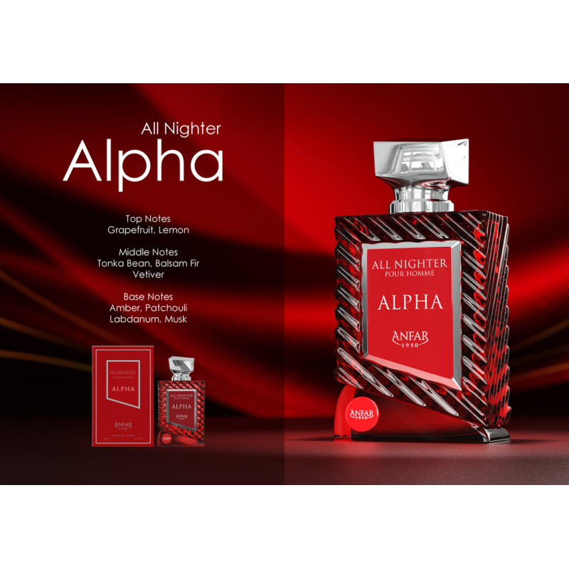 Anfar 1950 All Nighter Alpha Extrait 100 ml is a woody aromatic fragrance for men with grapefruit and lemon, evolving into tonka bean, balsam fir and vetiver over a deep base of amber, patchouli, labdanum and musk.