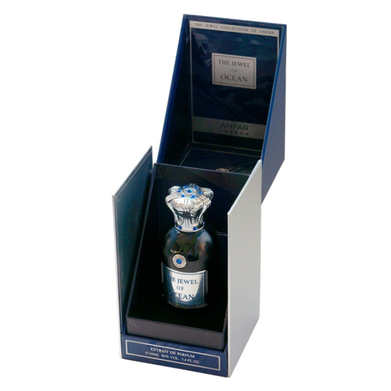 Anfar London The Jewel of Ocean Extrait de Parfum 100 ml is an aromatic aquatic fragrance with aldehydes, bergamot, lemon, ginger and mint, evolving into apple, pineapple and sage over a fresh base of ambergris, musk, cedar and vetiver.