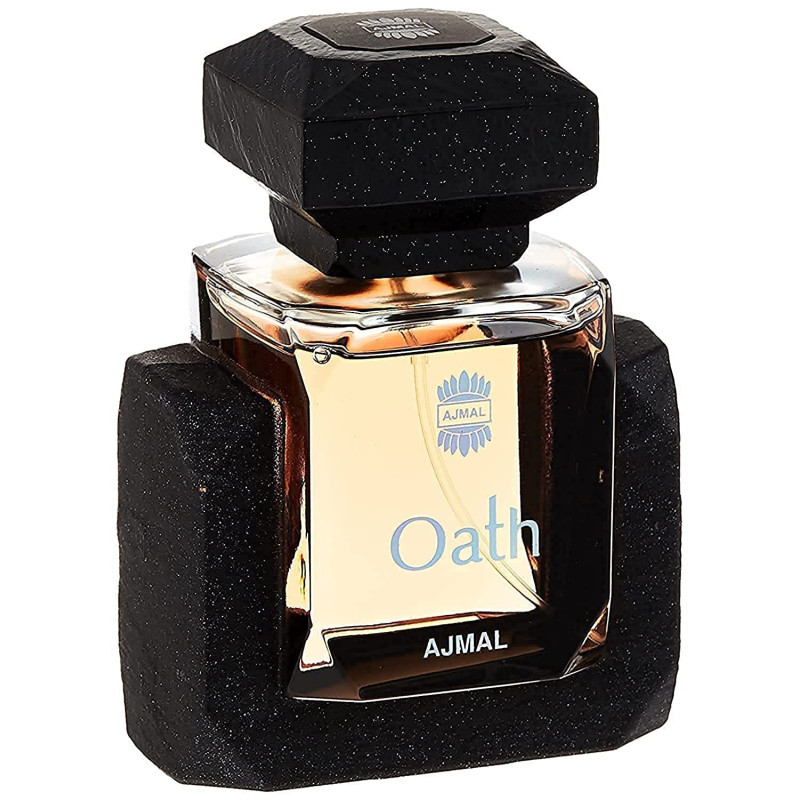 Ajmal Oath for Him 100 ml is a men's fragrance with citrus, floral, and woody notes. Top: orange, bergamot, plum, blackcurrant; heart: geranium, rose, jasmine; base: cedarwood, patchouli, musk. Elegant, versatile, and long-lasting.