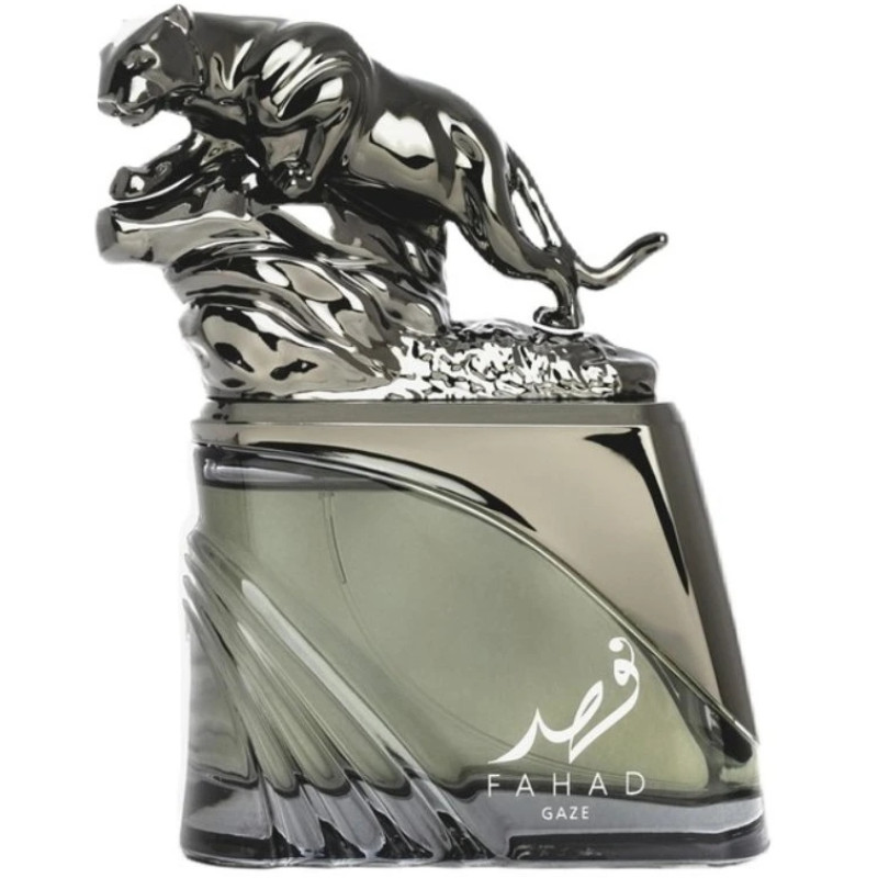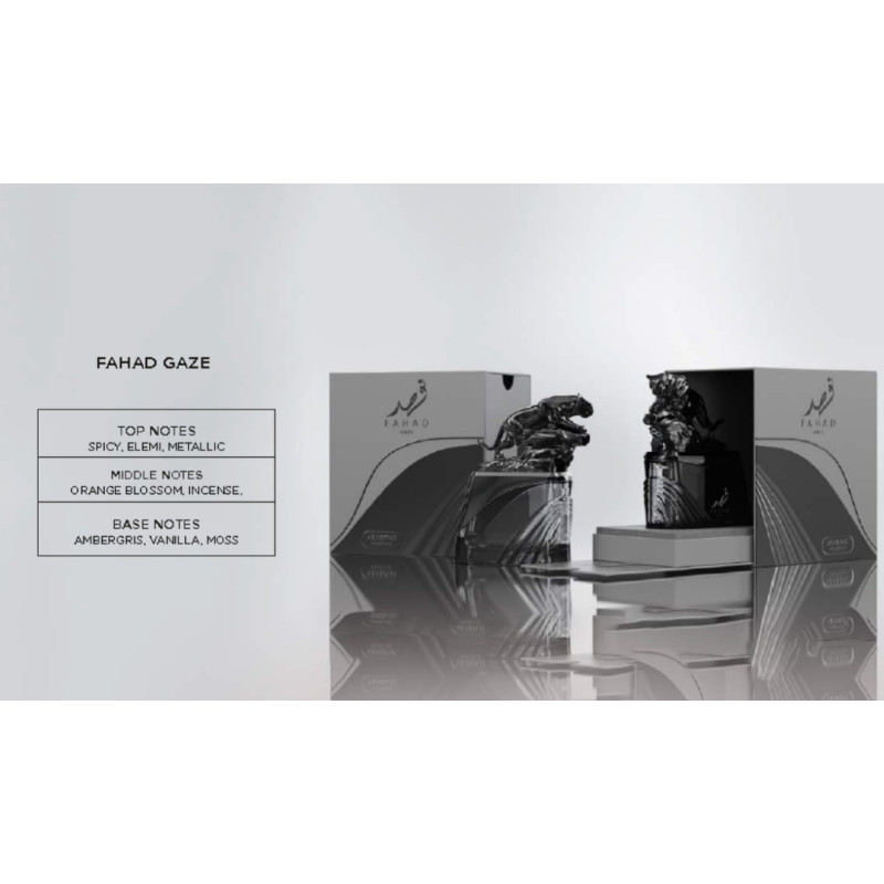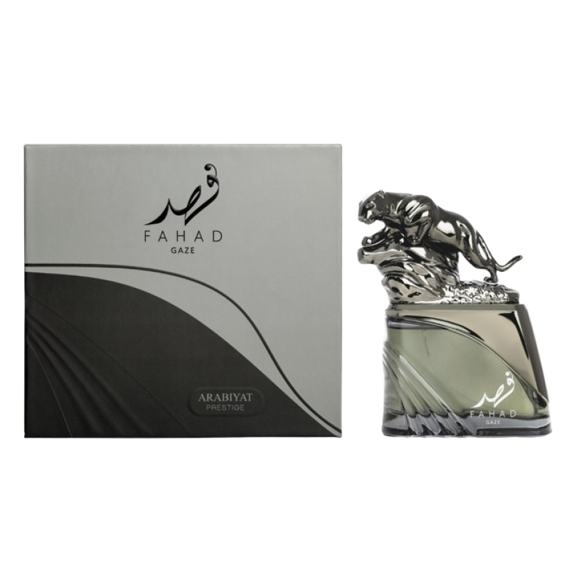 Arabiyat Prestige Fahad Gaze Eau de Parfum 100 ml is a men's woody-spicy fragrance with elemi, orange blossom, incense, patchouli, vanilla, and ambergris, offering a bold, warm, and sophisticated scent that is confident, elegant, and long-lasting.