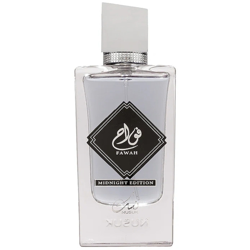 Nusuk Fawah Midnight Edition EDP is a unisex scent mixing burnt sugar, cardamom and cinnamon with smoky incense tones and a deep leather–cacao base. Sensual, bold and long-lasting — perfect for evening allure and refined mystery.