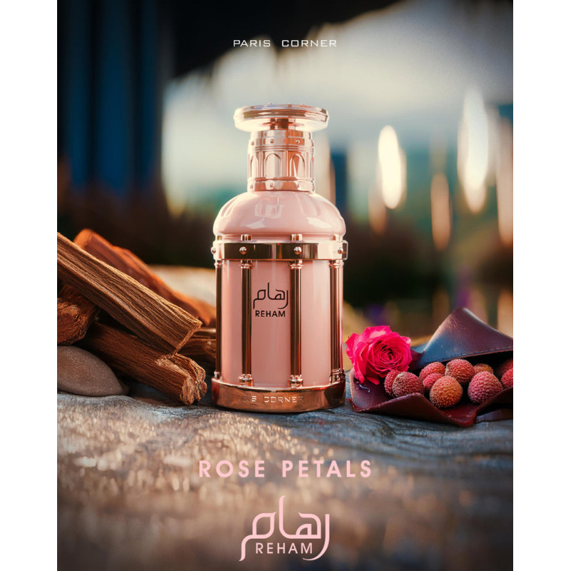 Paris Corner Reham Rose Petals is a fresh unisex Floral Fruity fragrance with raspberry, lychee, and bergamot, heart of rose and aquatic notes, and a warm amber, musk, and sandalwood base.