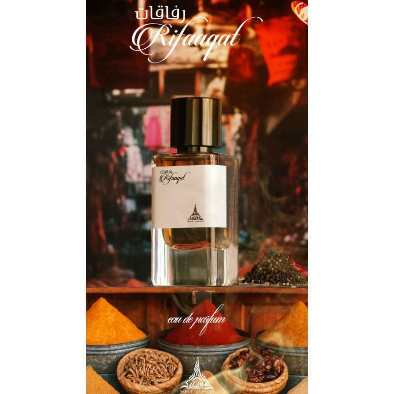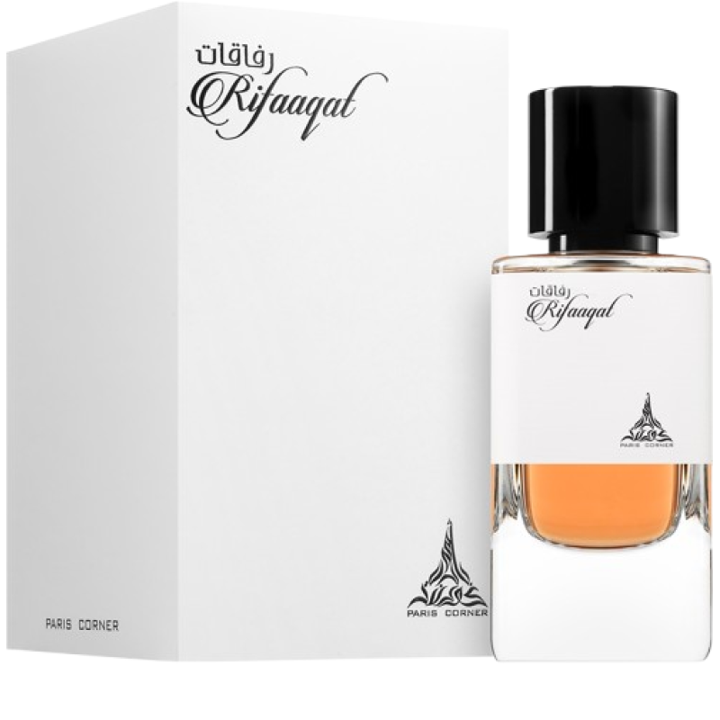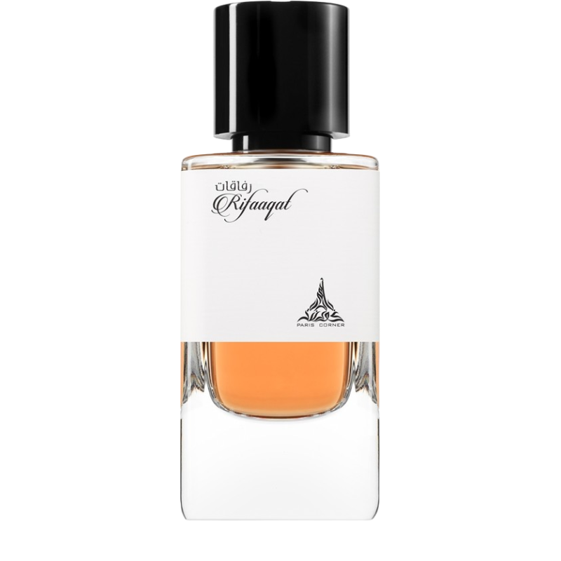 Paris Corner Rifaaqat Eau de Parfum is an 85 ml unisex Oriental Spicy fragrance from the UAE with top notes of black and pink pepper and elemi, a heart of frankincense and saffron, and a base of bourbon vanilla, suede, and cedarwood for a warm, spicy, lon