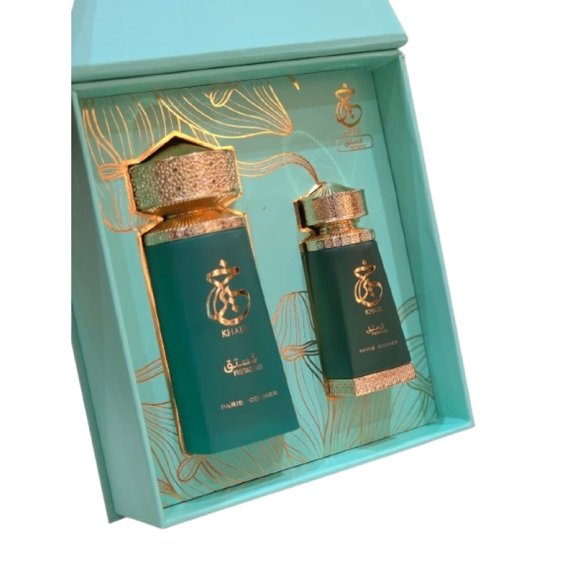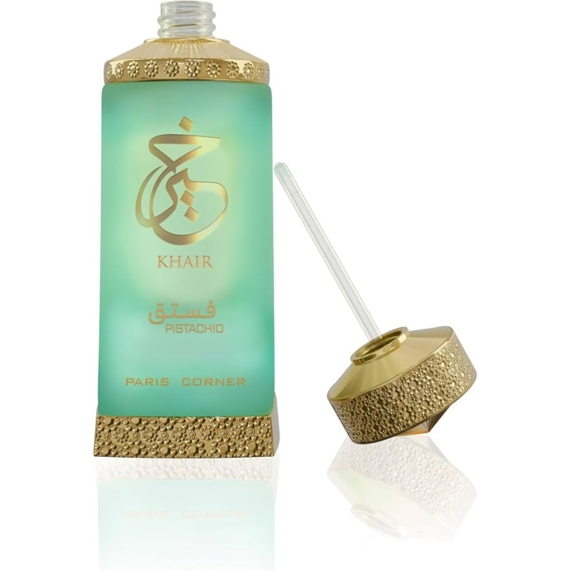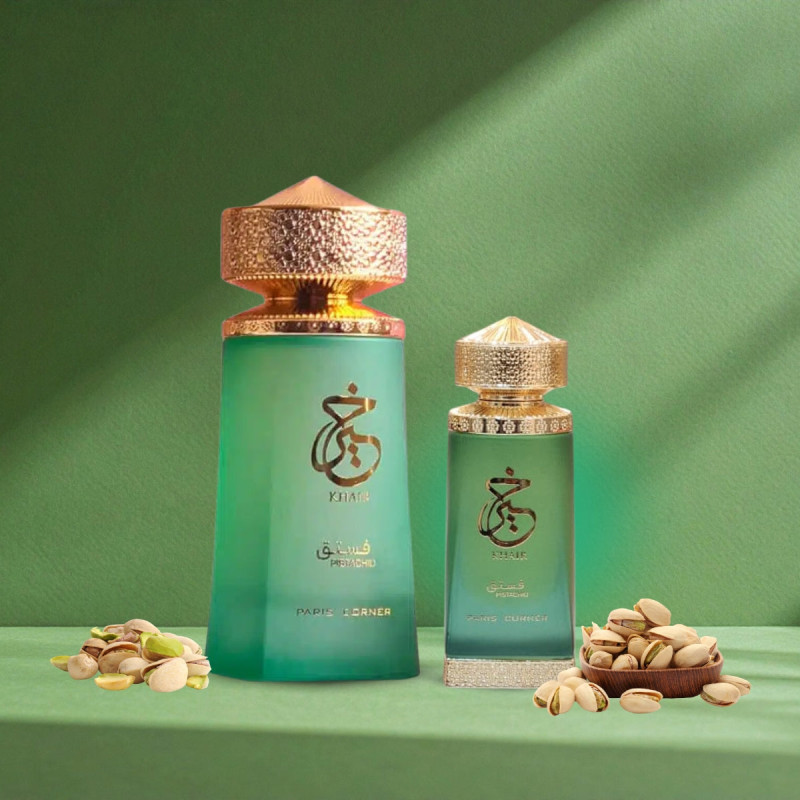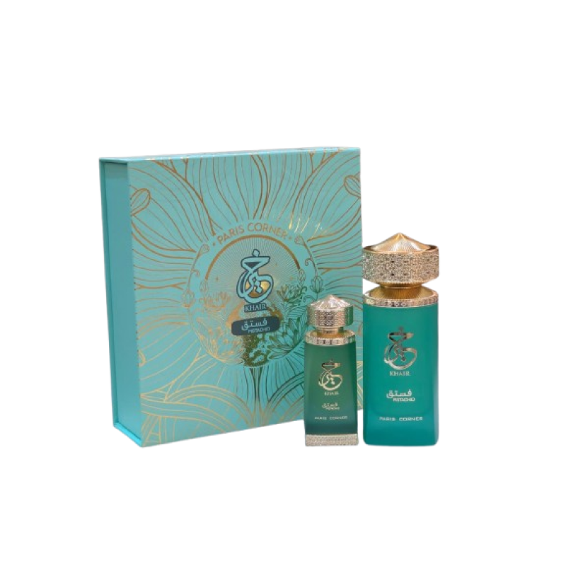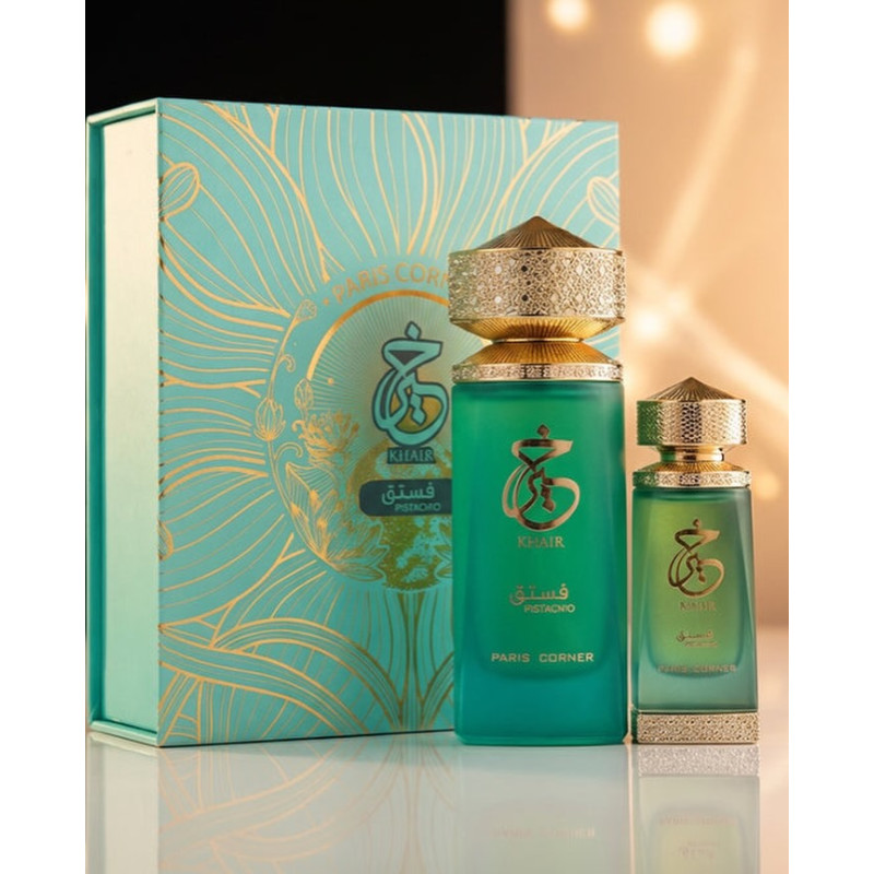 Paris Corner Khair Pistachio EDP 100 ml + Oil 25 ml is a floral fruity gourmand fragrance with pistachio, almond and bergamot, evolving into jasmine and milky notes over a warm base of vanilla, tonka bean and sandalwood.