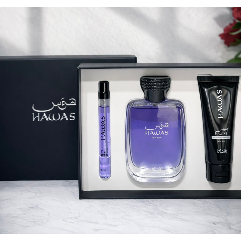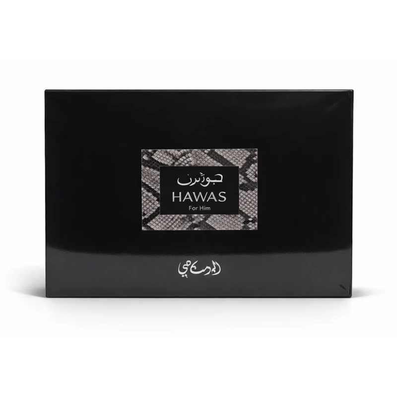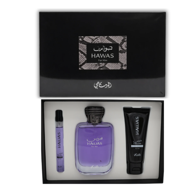 Rasasi Hawas For Him EDP Gift Set is a men’s aquatic-woody fragrance with fresh apple, bergamot, and lemon, a watery heart with plum and cardamom, and a warm ambergris-musk base. Includes EDP, travel spray, and shower gel.