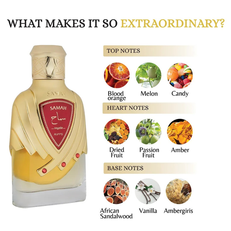 Riiffs Samah Royale White EXP is a luminous fruity-gourmand extrait blending blood orange, melon and candy with dried fruits, amber and passionfruit, finishing in creamy ambergris, sandalwood and vanilla. Joyful, warm and elegantly feminine.