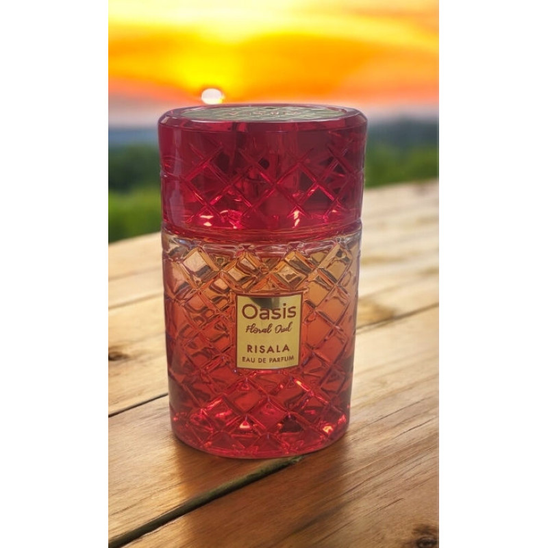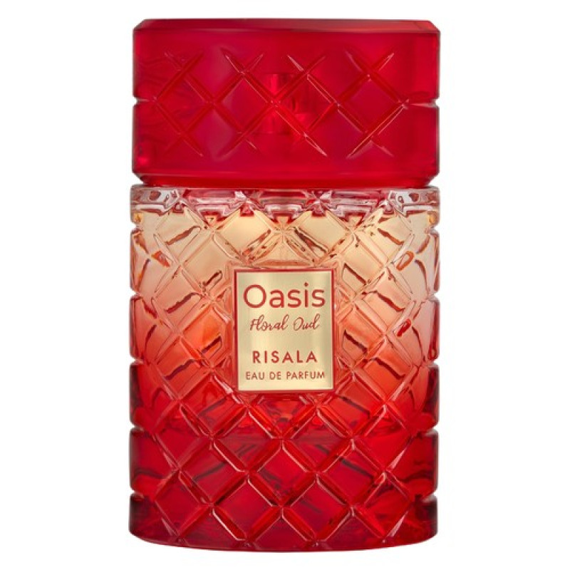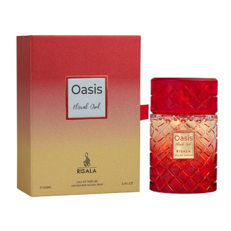 Risala Elite Oasis Floral Oud is a luxurious and feminine 100 ml Eau de Parfum that harmoniously blends fruity brightness with rich floral and gourmand undertones.