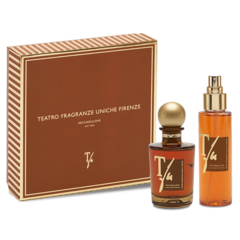 Patchoulove Gift Box by Teatro Fragranze Uniche is a refined home fragrance set with a 100 ml diffuser and fabric spray. Warm patchouli blends with vanilla, caramel and woods, creating a cozy, elegant scent for interiors and textiles.