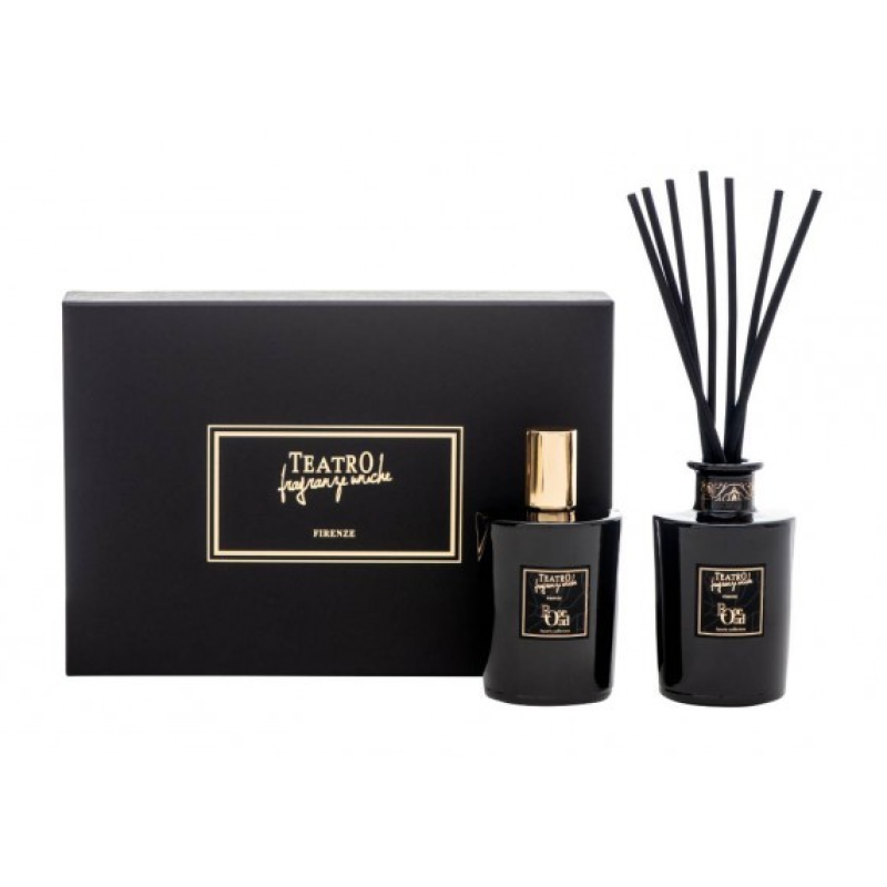 Sinfonia Rose Oud Mini Gift Set by Teatro Fragranze Uniche combines a 100 ml diffuser and 100 ml spray with an opulent rose, oud and resinous woody scent, creating a warm, luxurious and elegant home atmosphere.