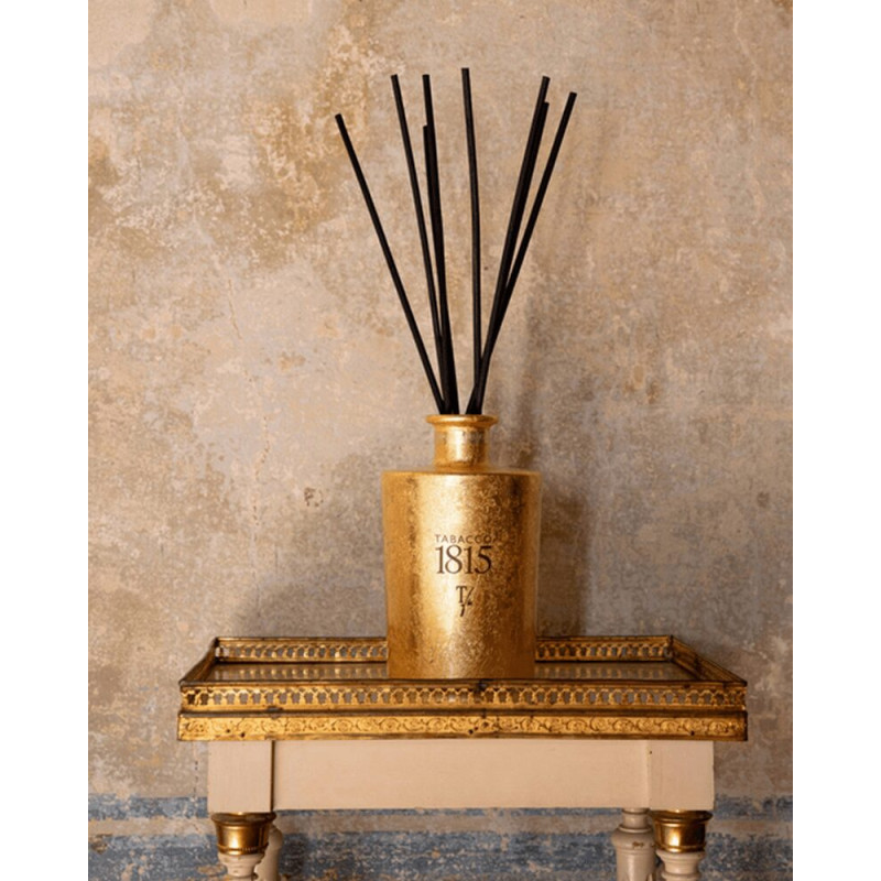Teatro Fragranze Uniche Tabacco 1815 Sticks 250 ml Gold Vase is a luxury home diffuser with cinnamon, cloves and wormwood, evolving into tobacco and vetiver over a warm base of vanilla and amber. Elegant, warm and long-lasting.