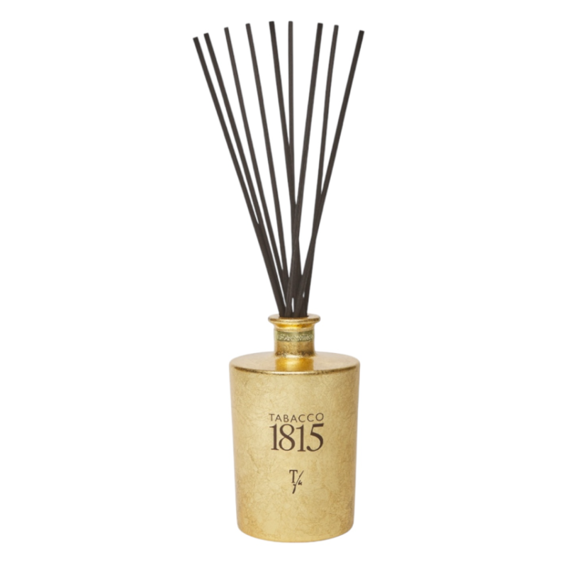 Teatro Fragranze Uniche Tabacco 1815 Sticks 500 ml Gold Vase is a luxury home diffuser with cinnamon, cloves and wormwood, evolving into tobacco and vetiver over a warm base of vanilla and amber. Elegant, warm and atmospheric.