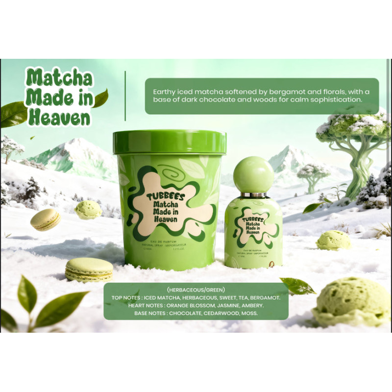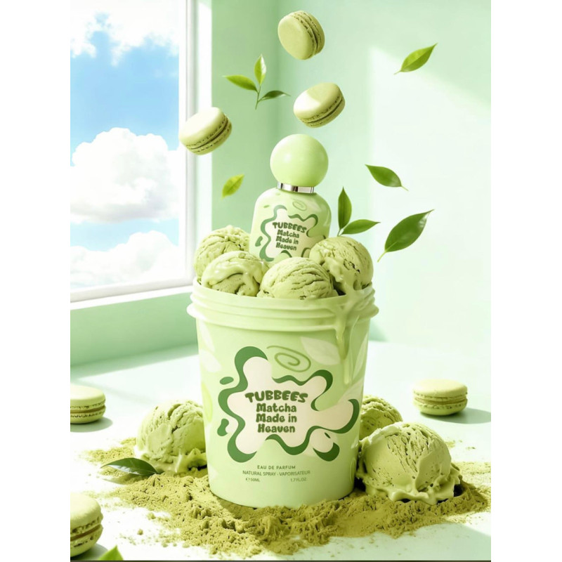 Tubbees Matcha Made In Heaven Eau de Parfum 50 ml is a unisex green-gourmand fragrance with matcha, bergamot, orange blossom, jasmine, chocolate, and cedarwood, offering a fresh, calming, and elegant scent that is soothing, refined, and long-lasting.