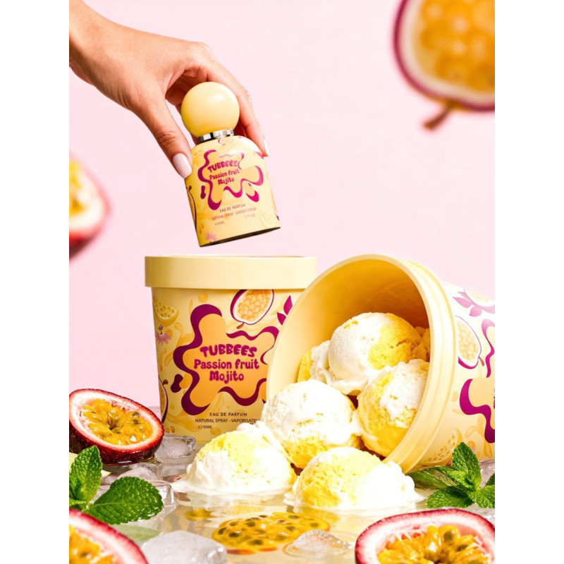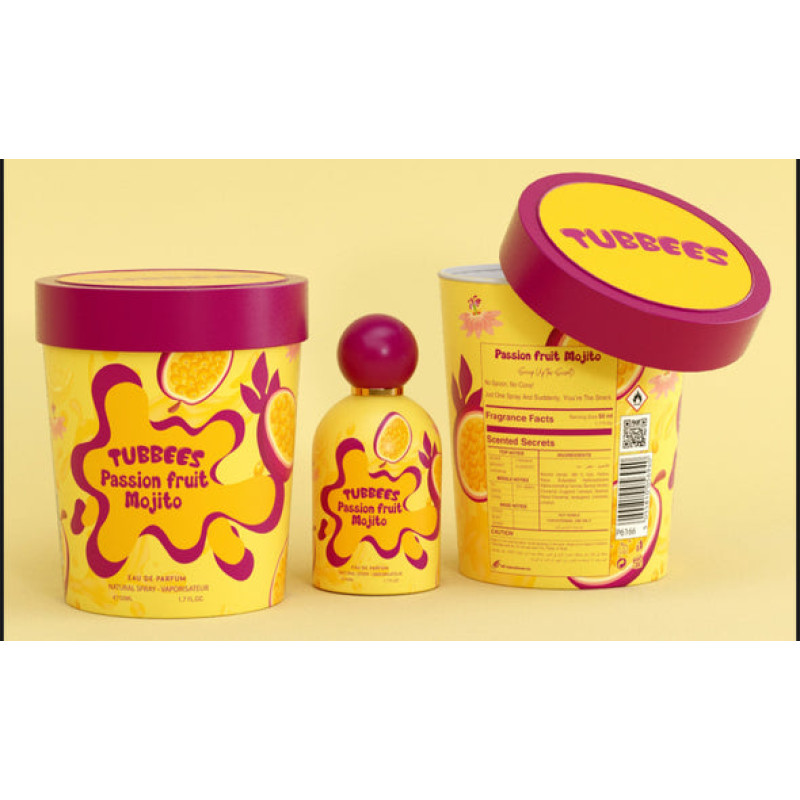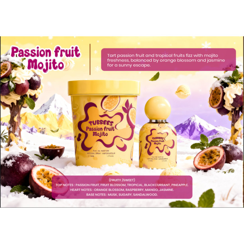 Tubbees Passion Fruit Mojito Eau de Parfum 50 ml is a unisex fruity-sweet fragrance with passion fruit, pineapple, orange blossom, jasmine, musk, and sandalwood, delivering a tropical, vibrant, and playful scent that is refreshing, warm, and long-lasting.