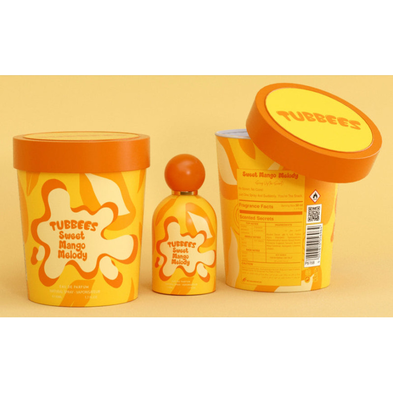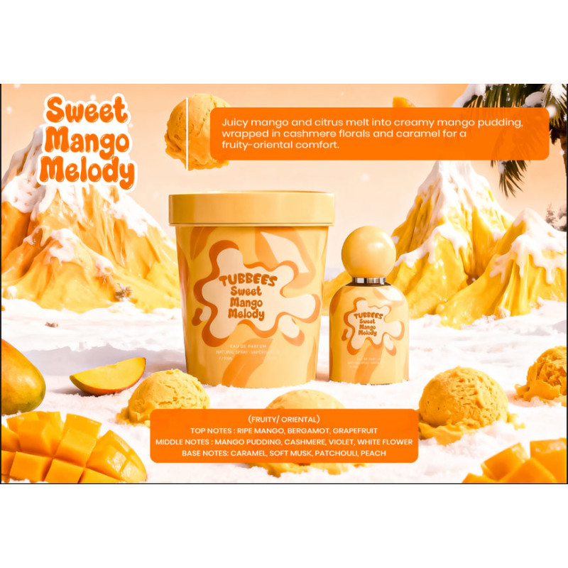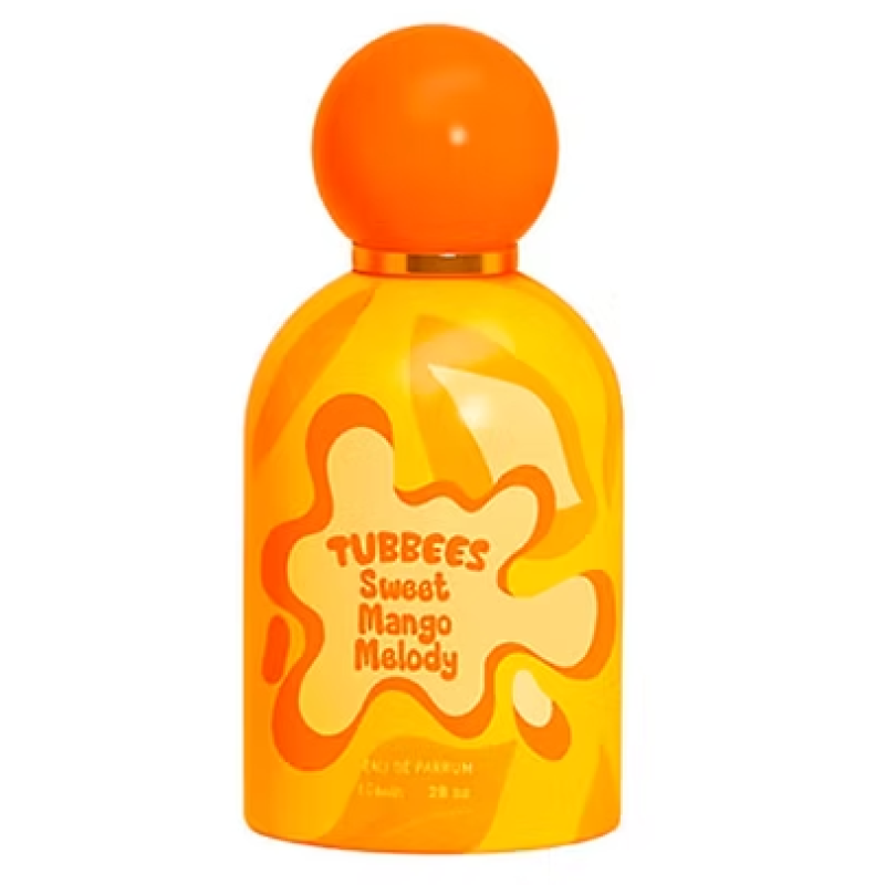 Tubbees Sweet Mango Melody Eau de Parfum 50 ml is a unisex fruity-gourmand fragrance with mango, bergamot, grapefruit, violet, caramel, and musk, offering a tropical, creamy, and playful scent that is vibrant, indulgent, and long-lasting.