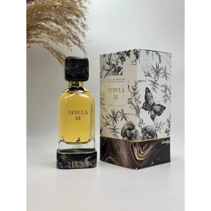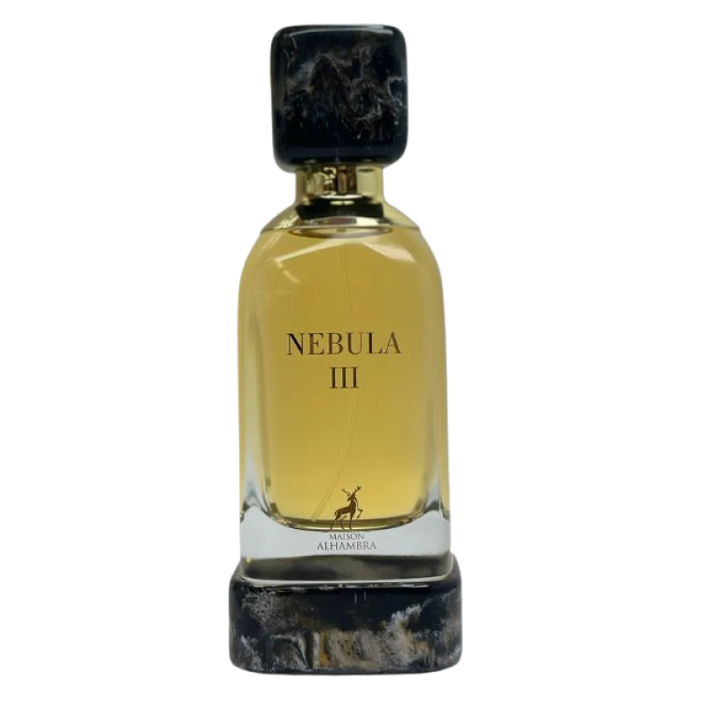 Maison Alhambra Nebula III 100 ml is a unisex Fruity Floral Eau de Parfum with warm spices, citrus, rose, jasmine, sandalwood, amber, vanilla, and white musk, offering a long-lasting, elegant, and captivating scent for special occasions.