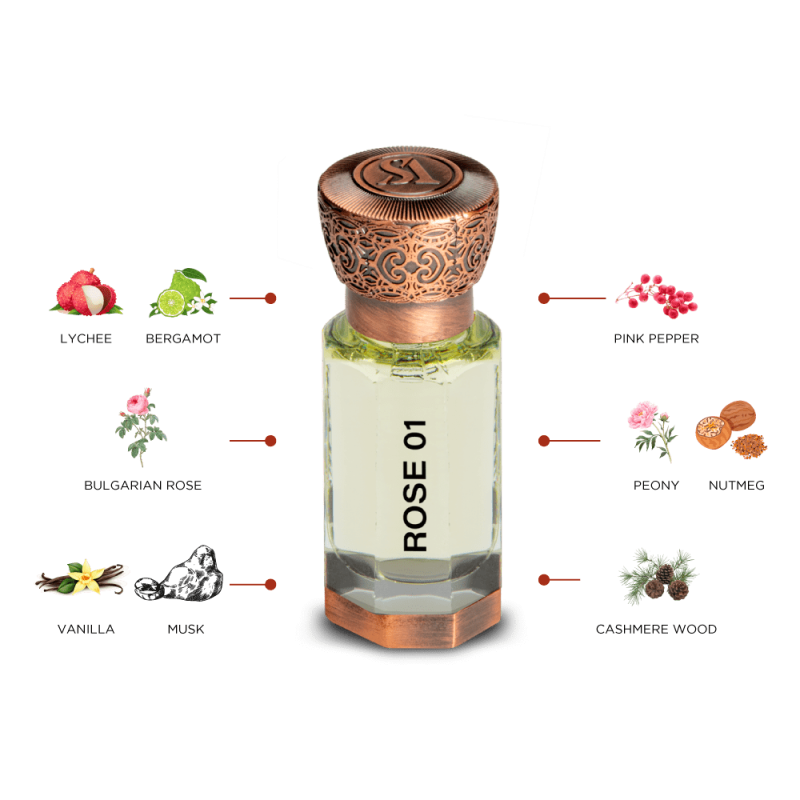 Swiss Arabian Rose 01 is a concentrated perfume oil blending juicy lychee and bergamot with elegant Bulgarian rose, soft peony and a smooth vanilla-musky base. A modern, refined rose scent with long-lasting intimacy.