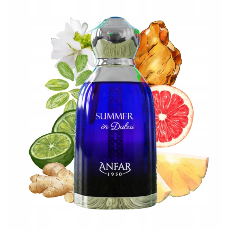 Anfar 1950 Summer in Dubai Extrait de Parfum 100 ml is a fresh citrus aromatic fragrance with grapefruit, bergamot, pineapple and sea notes, evolving into ginger and cardamom over a warm base of patchouli, ambroxan, tonka bean, musk and amber.