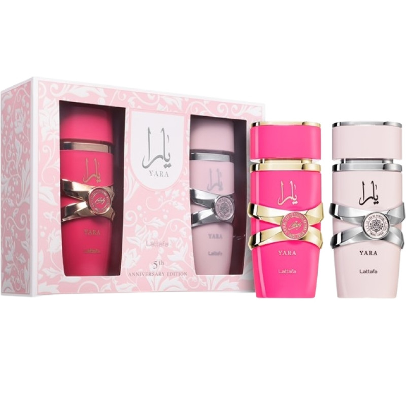 Lattafa Yara 5th Anniversary Edition Gift Set pairs two beloved Eau de Parfum creations — Yara EDP and Yara Candy EDP (both 100 ml) — offering a radiant journey through fruity, floral and gourmand notes. Designed for women who enjoy expressive, joyful and memorable scents, this duo brings together elegance, sweetness and irresistible warmth in one beautifully curated box.